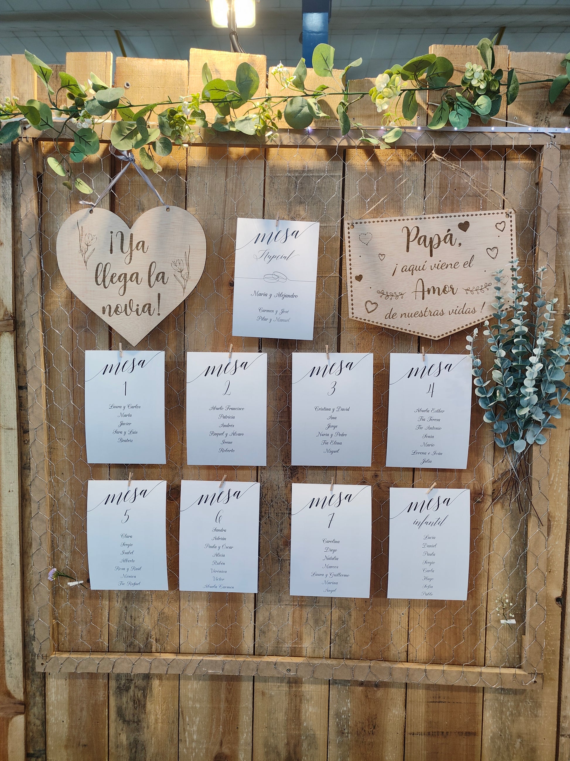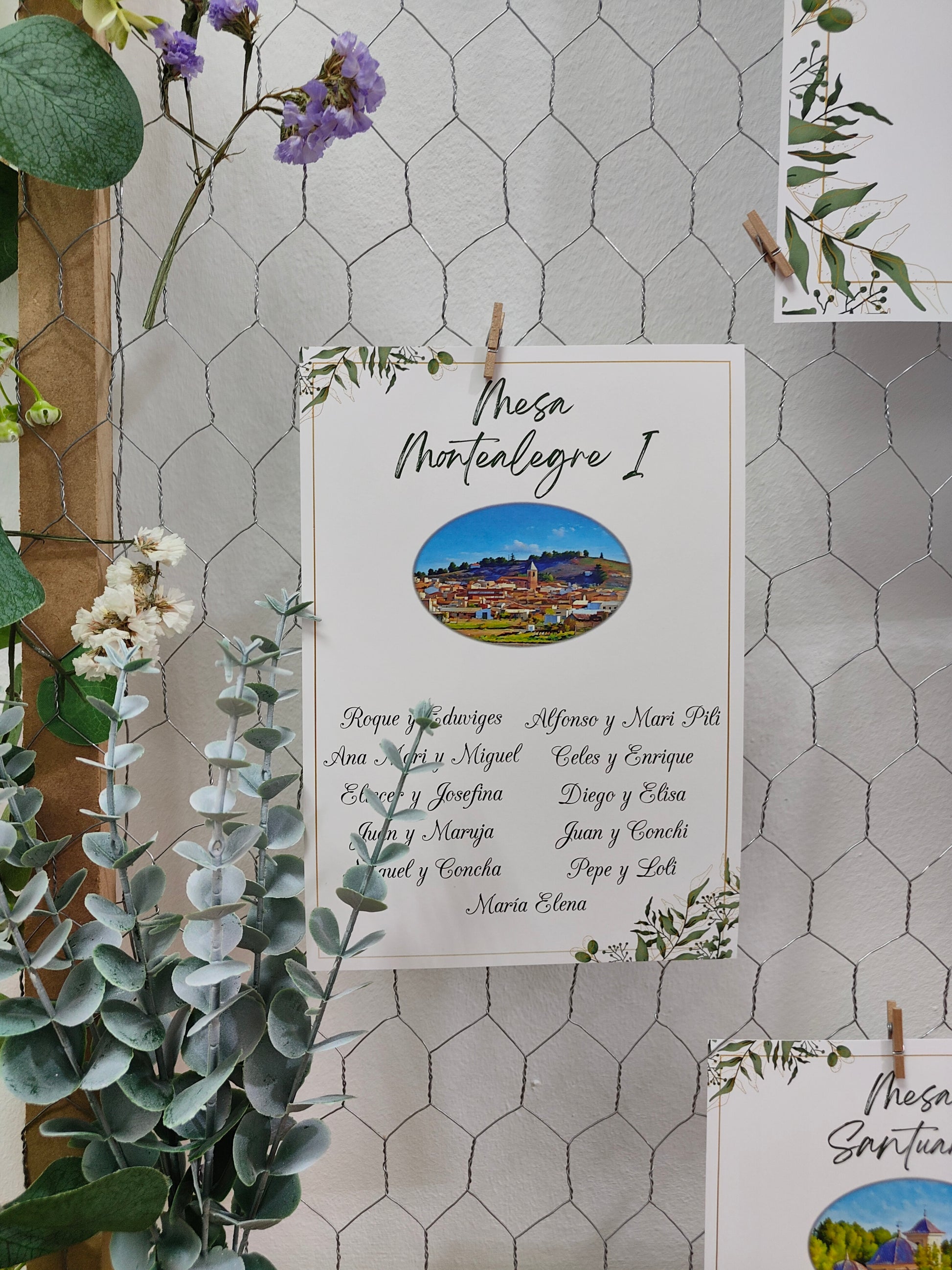 Creamos el diseño de tu seating plan totalmente personalizado, con la estética de tu evento. Puedes elegir ilustraciones, colores y estilo (rústico, moderno, elegante, etc). Incluye los nombres de los invitados organizados por mesas.