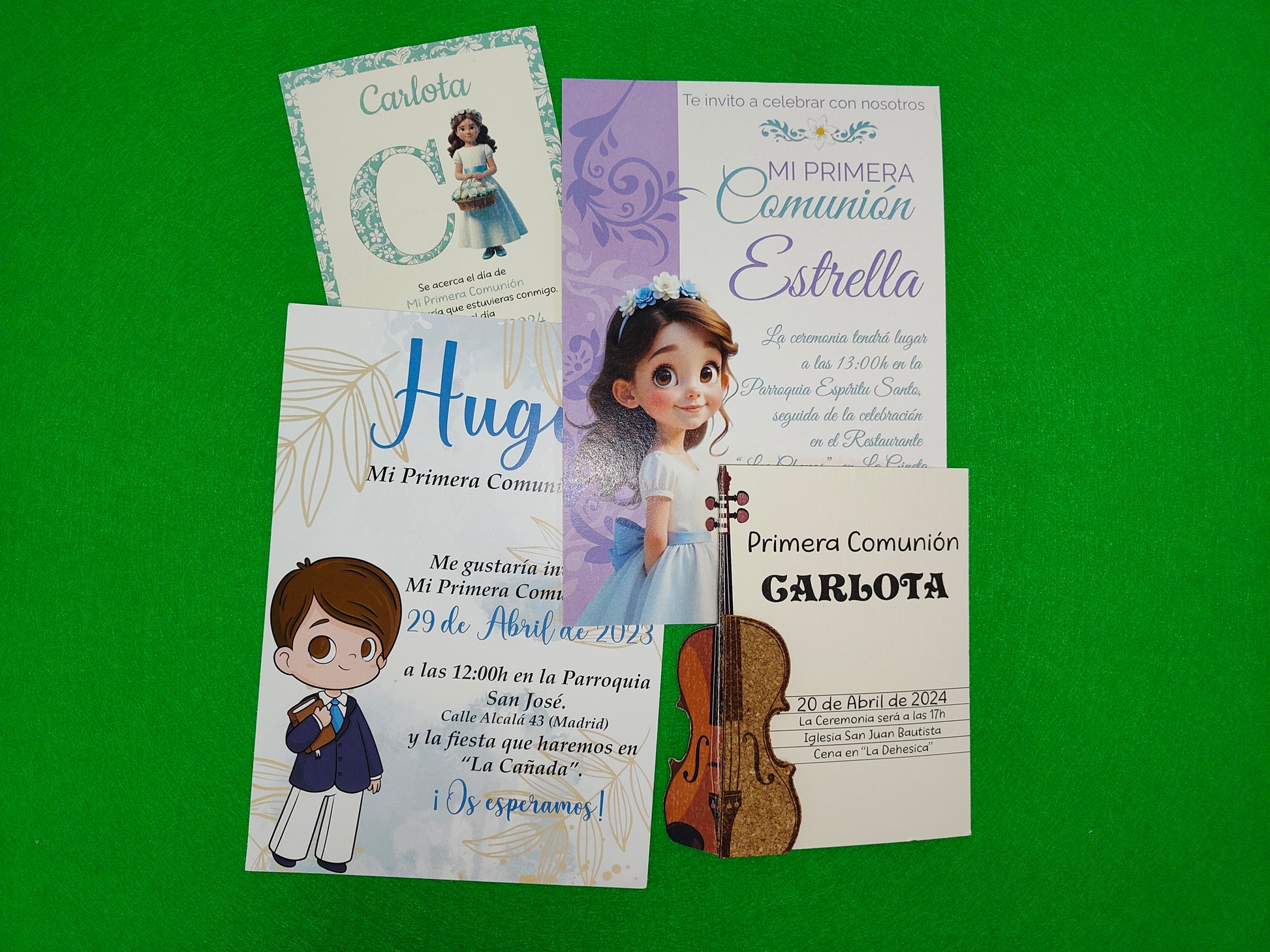 Diseñamos invitaciones digitales para comunión adaptadas a cualquier estilo y gusto. Desde diseños clásicos con muñecos tradicionales, hasta opciones modernas con fotos reales o ilustraciones tipo cartoon personalizadas ¡donde convertimos al protagonista en un personaje adorable!