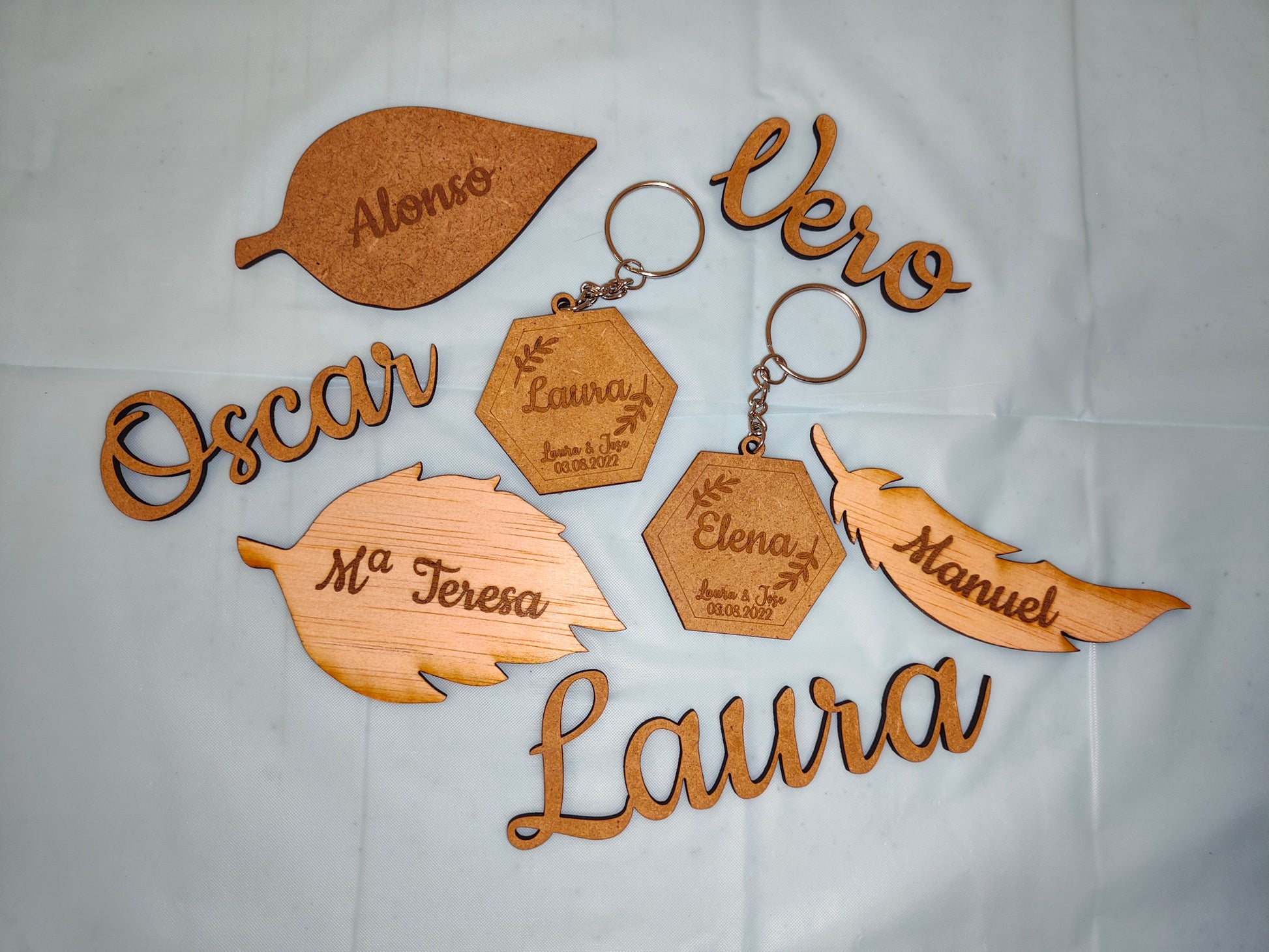 Marcasitios personalizado en madera, con el nombre de cada invitado. Ideal para decorar la mesa en bodas, comuniones o celebraciones. Tamaño, forma y tipografía personalizables. (Sin llavero)
