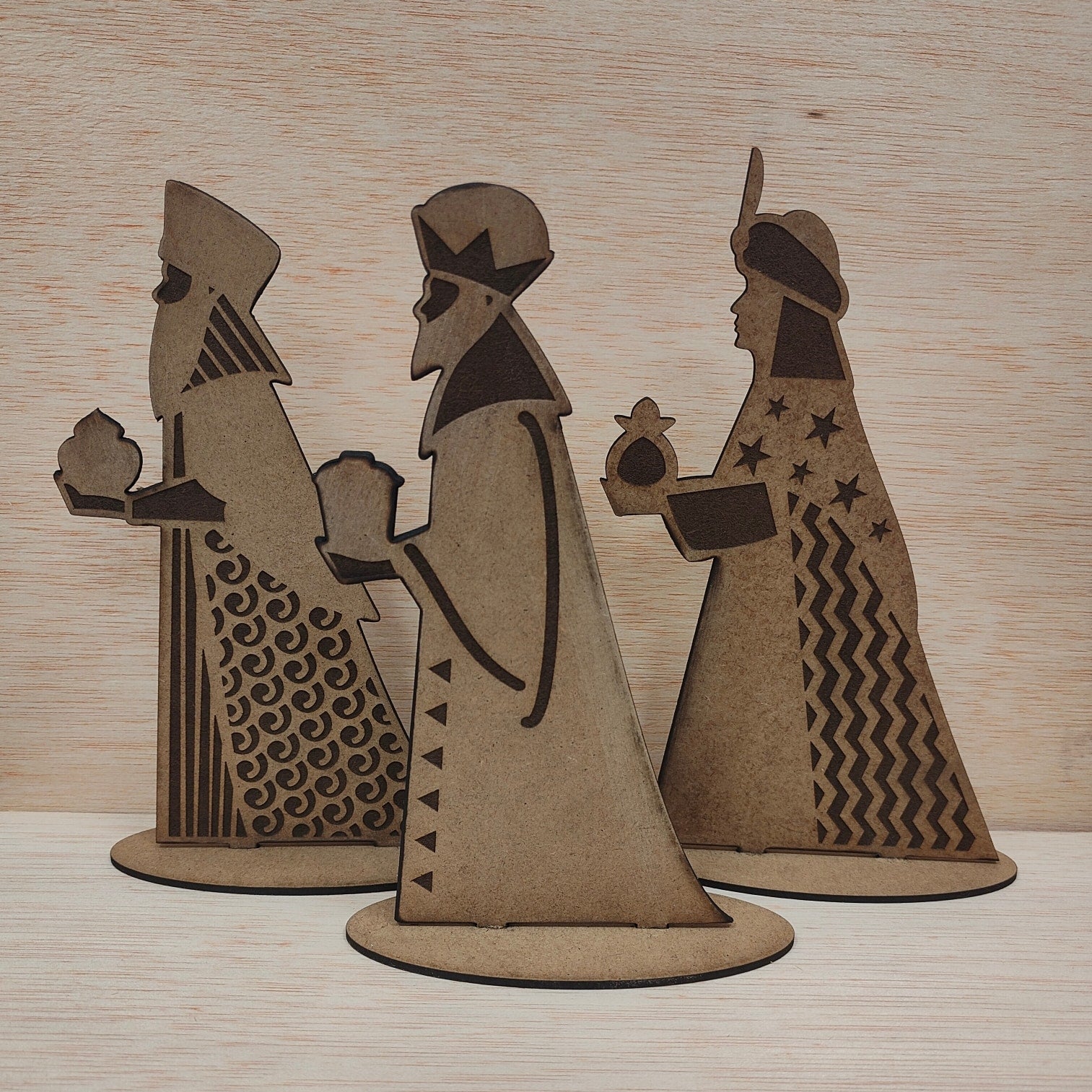 👑Tres figuras de madera de unos 20 cm de altura, grabadas y cortadas a láser.